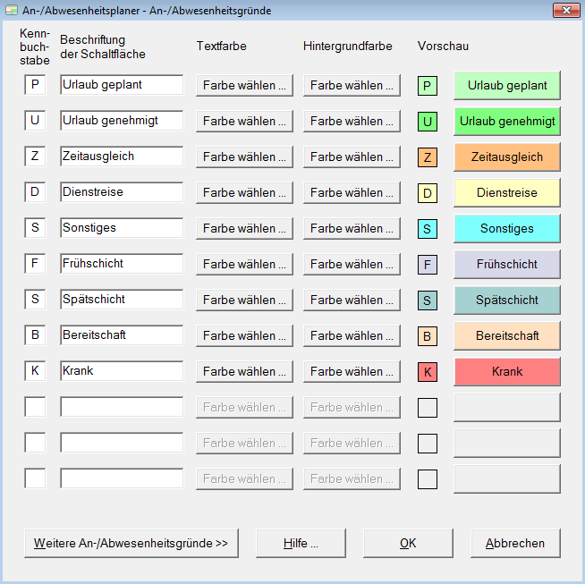 Geben Sie zu jedem gewünschten An-/Abwesenheitsgrund einen Kennbuchstaben und den Beschriftungstext für die Schaltfläche ein. Text- und Hintergrundfarbe jedes An-/Abwesenheitsgrundes können Sie über die Schaltflächen Farbe wählen festlegen.